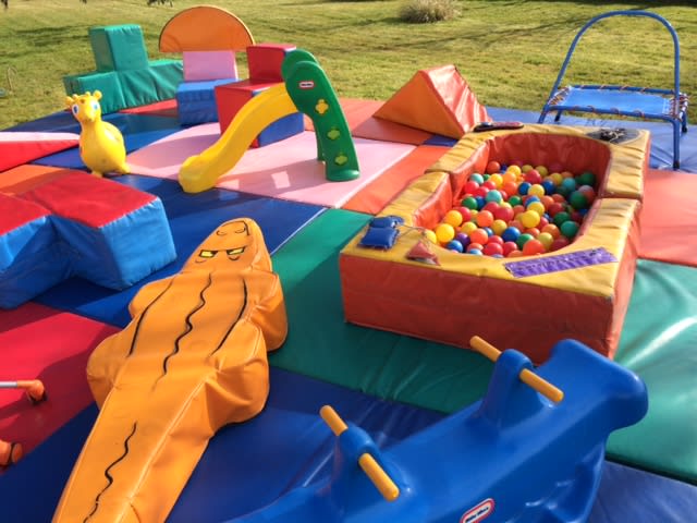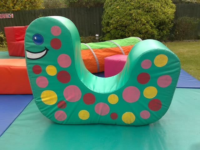 12 mats (6x4) 8 Large soft play pieces / 2 soft play animal shapes 2 sit on animal hoppers / 1 seesaw / 2 scuttle bug bikes / 6x3 soft play ballpond / 2 tunnels / slide / mini trampoline.