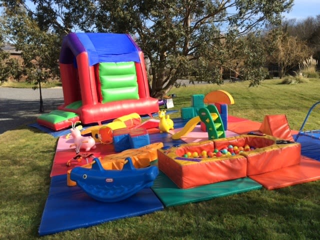 12 soft play mats (6x4) / 8 large pieces of soft play / 2 soft play animal shapes 2 sit on animal hoppers / 1 seesaw / 1 small slide / 2 play tunnels 6x3 ballpond / mini trampoline / 2 scuttle bug bikes / 9x12 castle for ages up to 12's.